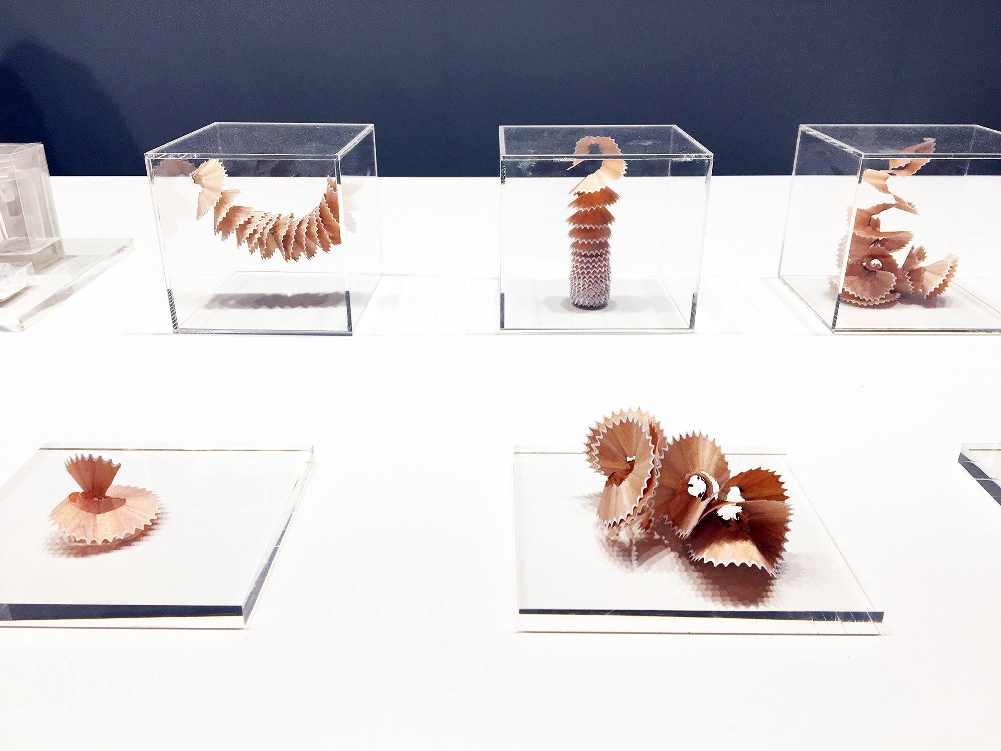 Chez Tsugano Pencil Sharpener, les taille-crayons laissaient la vedette aux pelures de crayon ! Ces fragiles restes d’affûtage étaient présentés sous des cubes de plexiglass. Leur beauté ordinaire était ainsi mise en valeur, comme un éloge à la fragilité et à l’impermanence.